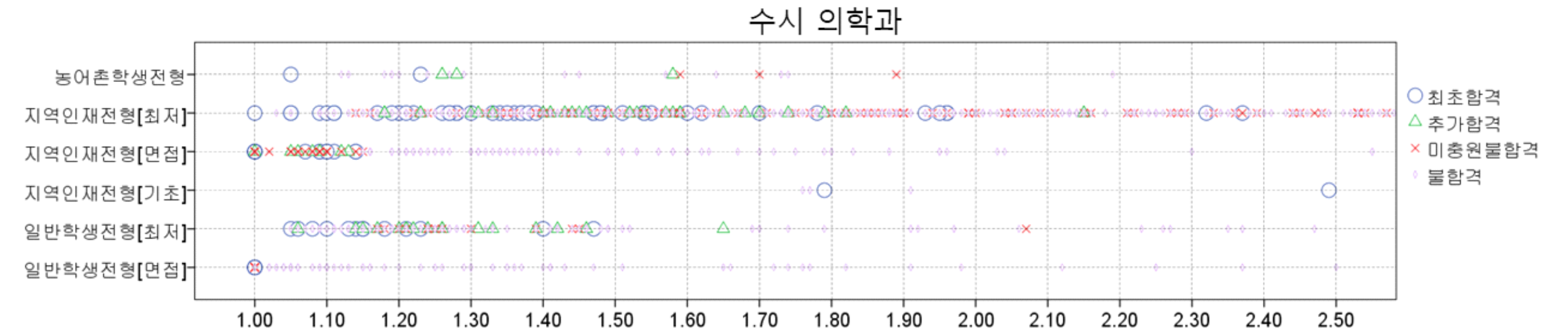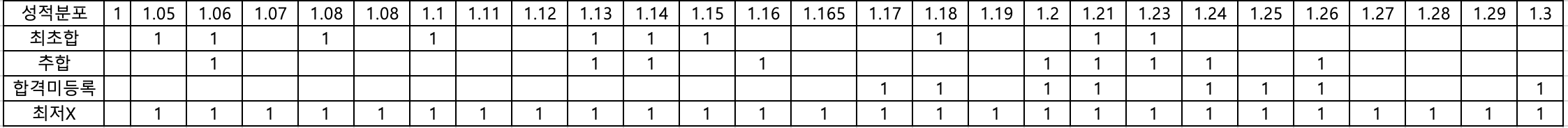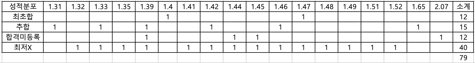 위 표는 최초합인 학생들의 성적 / 추가합격자 성적 / 미충원불합격 / 애초에 불합격(수능최저를 맞추지 못 했거나 면접에서 탈락한)을 순서대로 표에 넣어보았습니다.